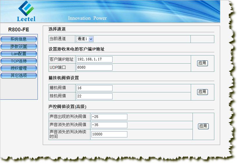 ????? Rx00-FE設(shè)備內(nèi)置了一個WEB服務(wù),用戶可以通過瀏覽器訪問,設(shè)置參數(shù)。在瀏覽器的地址欄中輸入設(shè)備的IP地址,回車后,出現(xiàn)設(shè)備的WEB頁面。在左邊選中參數(shù)設(shè)置,右邊將出現(xiàn)參數(shù)設(shè)置頁面。先選擇通道,然后在底下輸入對應(yīng)的客戶端IP地址和端口,點擊右邊的“應(yīng)用”按鈕。