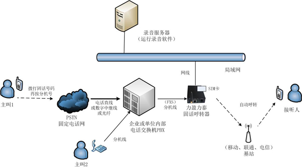 目前,有的企業(yè)或單位的人員在外出時(shí),需要將直線電話呼轉(zhuǎn)到某個(gè)手機(jī)號(hào)碼上進(jìn)行接聽,現(xiàn)成的方案是固話運(yùn)營(yíng)商提供的呼轉(zhuǎn)服務(wù)。這種方案雖然實(shí)現(xiàn)起來(lái)簡(jiǎn)單,但該企業(yè)無(wú)法對(duì)不經(jīng)過(guò)本線路的呼轉(zhuǎn)出去的通話進(jìn)行錄音,而且固話運(yùn)營(yíng)商也不提供通話錄音服務(wù),因此如果涉及到重要業(yè)務(wù)的直線電話,呼轉(zhuǎn)和錄音是個(gè)矛盾。